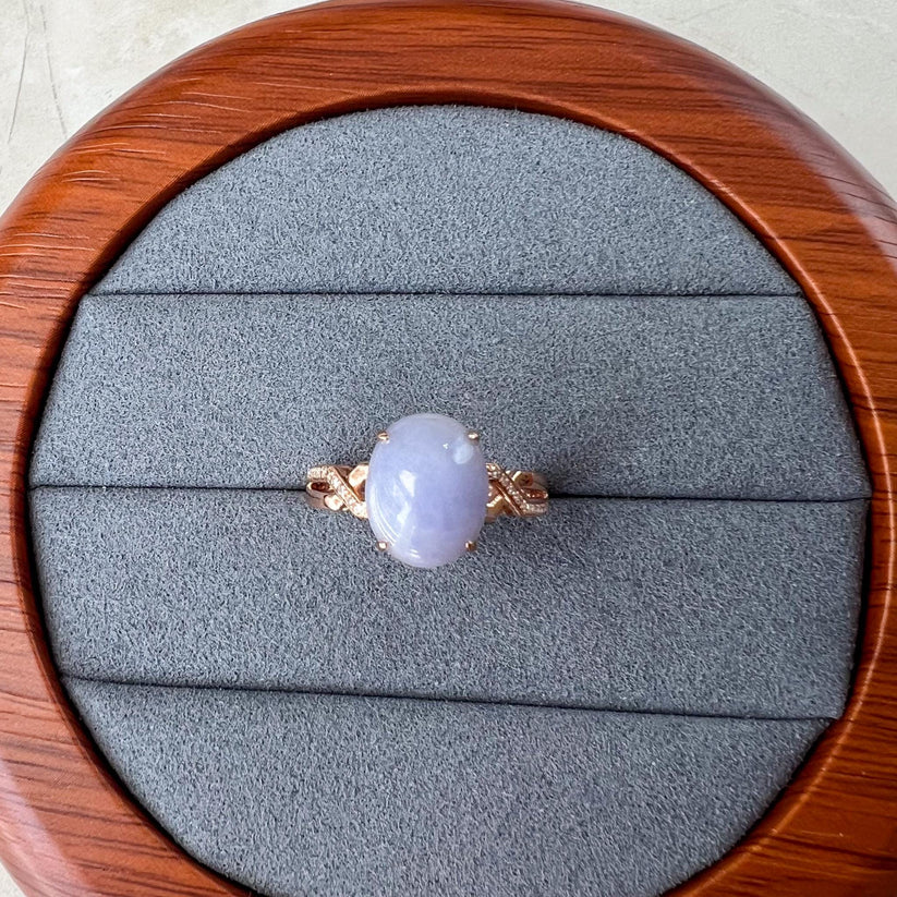 Indulge in soft sophistication with Jade’s Lavender Purple Jadeite Ring, featuring a smooth oval jadeite center set in 18K rose gold and accented with natural diamonds for a refined, luminous finish.