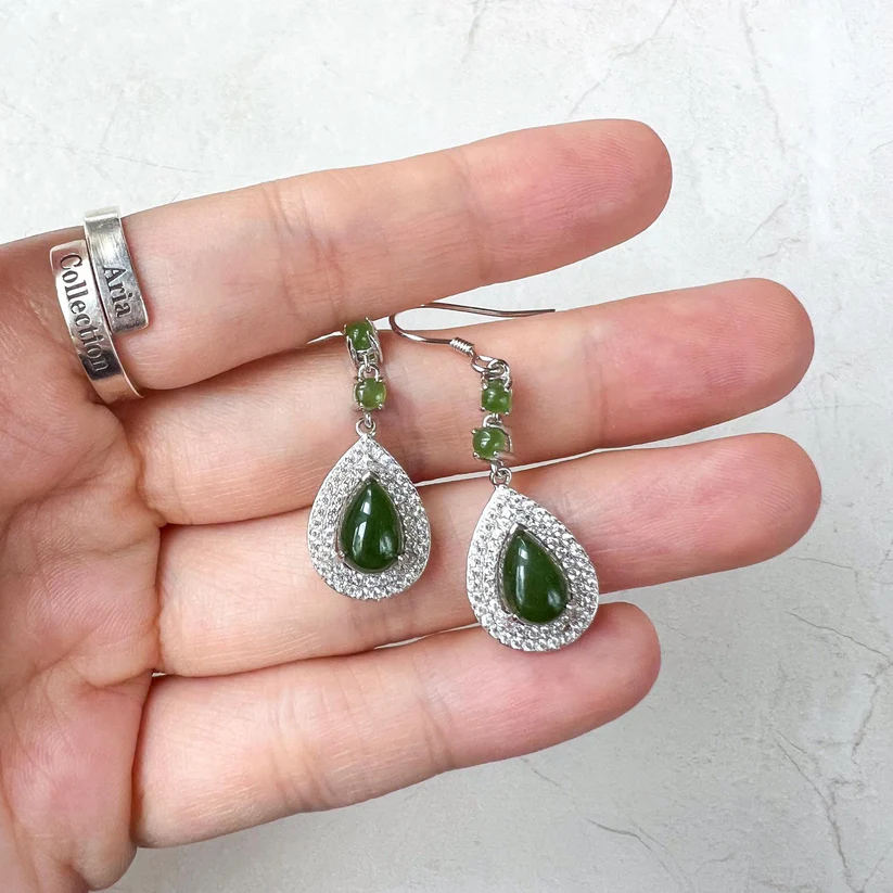 Embrace graceful sophistication with the Jade Teardrop Earrings, a timeless design centered around a striking teardrop-shaped nephrite jade stone. The rich green jade is framed in polished 925 sterling silver, creating a radiant contrast that enhances its natural beauty and elevates the entire look. Above the teardrop, a delicate vertical arrangement of small jade beads adds balance and harmony, offering a refined layered detail that feels both elegant and organic.