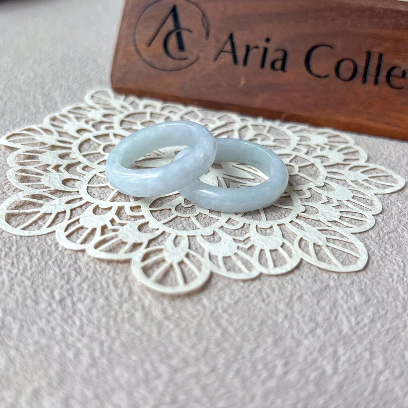 Each ring is carved from 100% natural jadeite, allowing for subtle variations in shading—from milky white to delicate light green—that give every piece its own character and uniqueness. The smooth, polished finish enhances the jade’s gentle translucency and organic elegance, making it a perfect everyday accessory or a meaningful addition to a curated jewelry collection.
